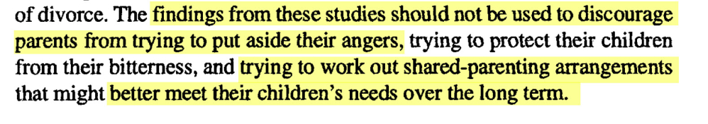 I denne delen av essayet kan vi se at psykologene ikke er like opptatt av at studier er fra utlandet, som tidligere. Årsak: studiene kan brukes til å underbygge deres oppfatning. Problemet er dog at de egentlig ikke gjør det. De viser bl.a.til en studie fra 1987, Johnston, Kline, & Tschann, og trekker frem hvordan delt omsorg ikke passet for barn hvis foreldre hadde svært stygge konflikter. Men her er en viktig nyanse. Hovedforskeren bak rapporten, Janet R. Johnston, har fra langt tilbake vært klar over at denne studien har vært brukt feil, slik de tre psykologene gjør her. I en nyere artikkel, «RESEARCH UPDATE Children’s Adjustment in Sole Custody Compared to Joint Custody Families and Principles for Custody Decision Making», fra 1995 skrev hun: