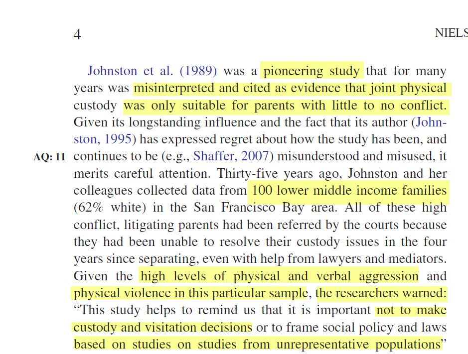 Dr. Linda Nielsen har også kommentert dette i sin artikkel fra artikkel fra 2016, Reexamining the Research on Parental Conflict, Coparenting, and Custody Arrangements :