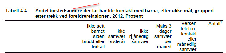 Nesten ingen mødre har sagt at far tok seg mest av barnet før brudd, noe flere fedre har hevdet. Men blant bostedsmødre som oppgir «like mye», er det fortsatt 23 % som ikke ser barnet mer enn maks 3 dager i måneden (merk at maks 5 dager er utelatt her, som betyr at tallet sanynligvis er høyere om man tar med alle som faller inn under lite til ingen kontakt). Det reflekterer ikke det ordningen de hadde før bruddet. Når man skal finne ut av noe, må man se på så mange studier som mulig. At psykologene utelater tall som ikke underbygger dere oppfatning, må jo nesten kunne sies å være ganske påfallende.
